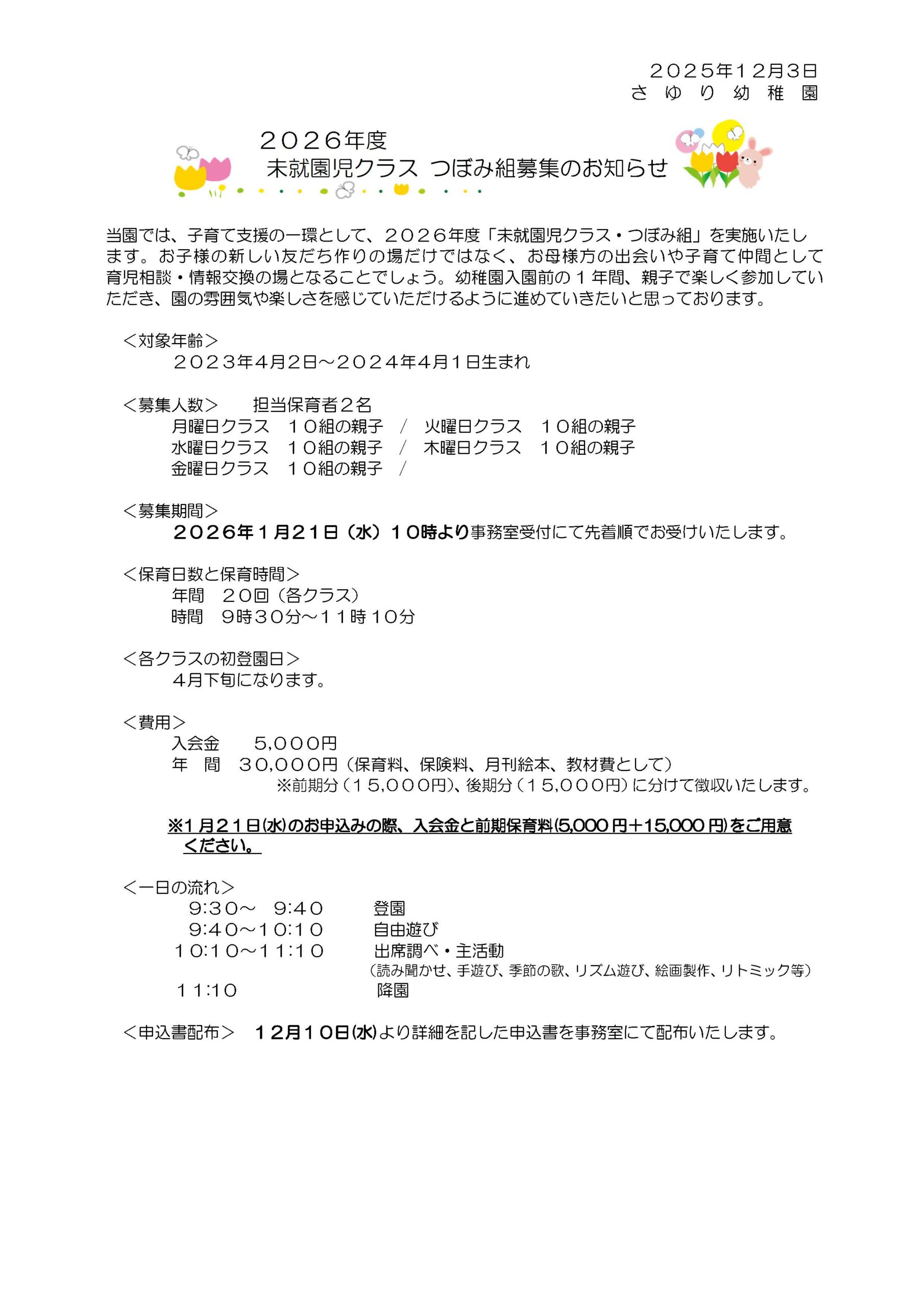 2025.12.5 2026年度 未就園児クラス つぼみ組募集のお知らせ